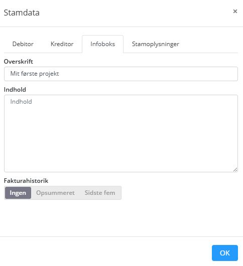 Hvis I ønsker at inkludere et overblik over faktureringshistorikken på et projekts fakturaer, kan I fremadrettet få det med. På projektets faktureringsfane kan I vælge, om I generelt på projektets fakturaer ønsker en opsummeret historik (dvs. tidligere faktureret samlet sum) eller de seneste 5 fakturabeløb. Indstillingen kan også tilvælges eller ændres i infoboksen på fakturakladden.