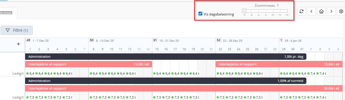 I medarbejdervisningen i Planlægning er det nu muligt at se belastning pr. dag på medarbejderen. Visning af belastning pr. dag kræver, at man står zoomniveau 1, hvor featuren kan slås til og fra.